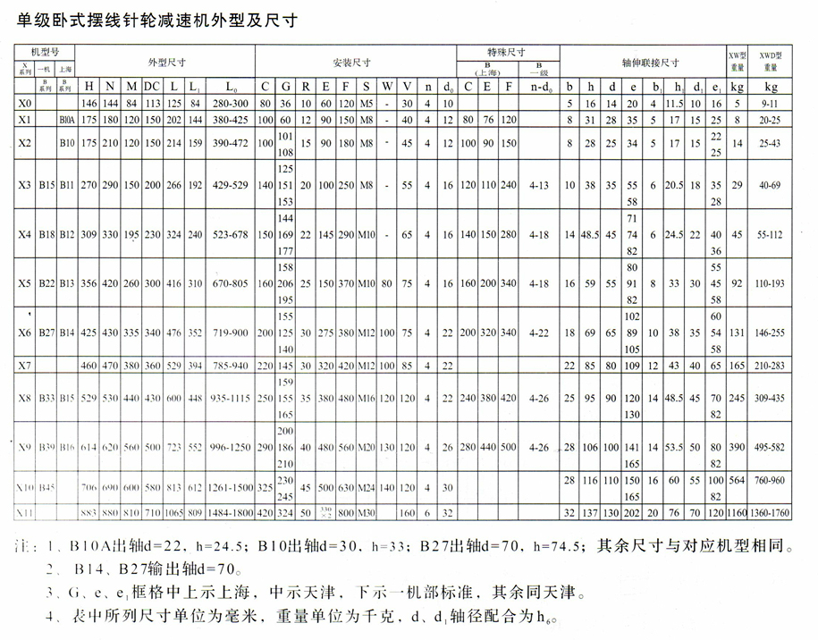 X.B臥式擺線針輪減速機具有傳動比大。一級減速時傳動比為1/6--1/87。兩級減速時傳動比為1/99--1/7569;三級傳動時傳動比為1/5841--1/658503。另外根據(jù)需要還可以采用多級組合,速比達到指定大。